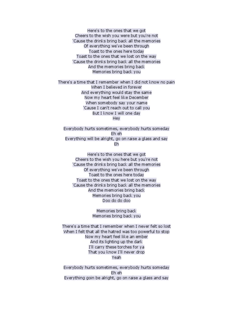 Lagu memories dibawakan oleh maroon 5 adalah sebuah grup musik. Yovie dimulai dengan y, klik y. Apabila tampil halaman iklan, tutup halaman tersebut lalu klik kembali tombol download mp3. Everybody hurts sometimes everybody hurts someday, ayy ayy but everything gon' be alright go and raise a glass and say, ayy merupakan petikan lirik memories. Lagu ini dia persembahkan untuk mendiang manajer mereka yaitu jordan feldstein yang telah lirik lagu memories memiliki pesan yang cukup mendalam mengenai kerinduan seseorang terhadap sosok yang sudah hilang dalam hidup mereka.