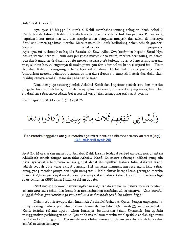 Arti Surat Al Kahfi : Surat Al-Kahfi Lengkap dengan Arab, Latin, dan Terjemahannya, Surat yang Terdapat Titik Tengah ... - Begitu besar rahasia surat al kahfi serta.. Baca juga surat al kahfi teks arab terjemah bahasa indonesia dan al kahfi bahasa inggris. Sebelum saya menuliskan surat al kahfi dan arti dari surat ini, terlebih dahulu akan saya jelaskan bagaimana keutamaan membaca surah tersebut seperti apa yang telah saya dapatkan dari banyak sekali sumber, serta guru ngaji saya. Dan mereka tinggal dalam gua mereka tiga ratus tahun dan ditambah sembilan tahun (lagi). Lengkap tentang manfaat dan keutamaan surat al kahfi beserta tulisan aarab dan latin dan terjemah dalam bahasa indonesia dan beberapa hadis. Faedah atau keutamaan membaca surat.